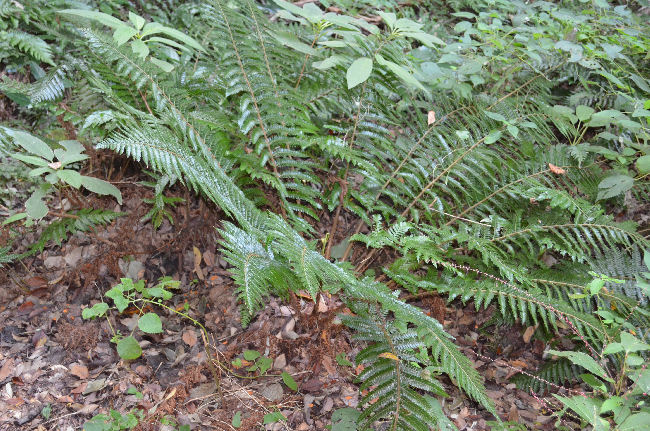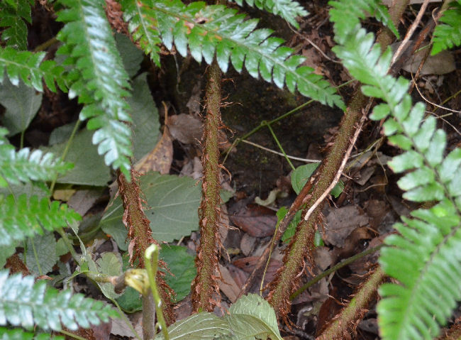鷹取山頂上付近の岩場では大きなイノデが多く、こちらはイノデの仲間のアスカイノデと思われる。アマチュアの私にはイノデの分類は難しい。ただし、アスカイノデは葉柄基部の鱗片が細く、鋸歯がなく、また褐色で先がねじれているなどの特徴が見られる。更に葉の裏面に毛が多い。